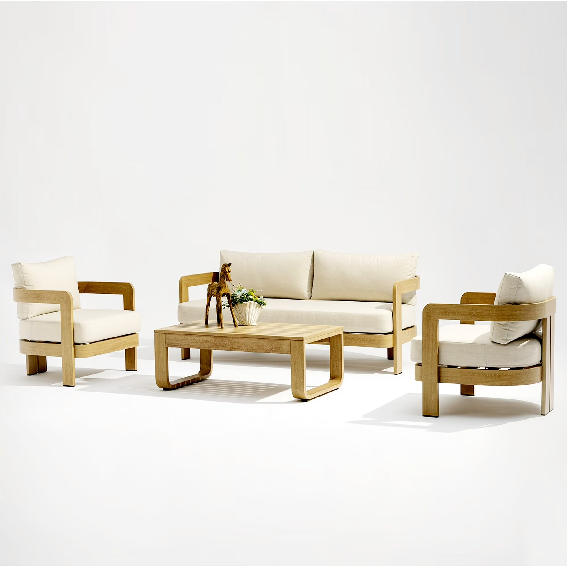 Crafted with a powder-coated aluminum frame and finished to replicate the look of natural wood, this contemporary outdoor sofa set blends sleek curves with practical strength. The weather-resistant and rustproof frame is ideal for year-round use on the patio, deck, balcony, or garden.